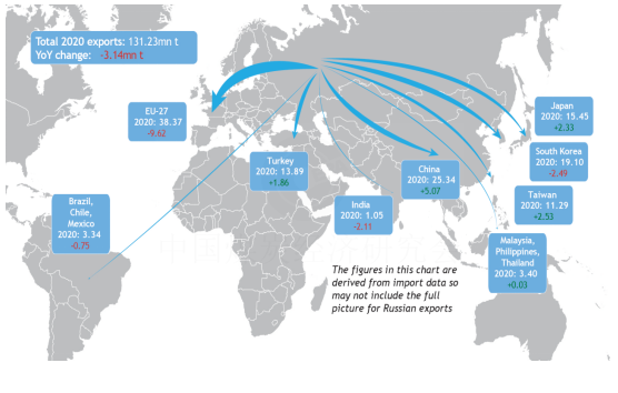 2020年远东港口煤炭出口1.072亿吨,其中7月-12月完成5720万吨,高于上半年1月-6月的5000万吨。主要是由于中国限制澳大利亚煤炭进口,以及东北亚地区去年冬季比往年更加严寒的气候因素影响, 去年下半年亚洲区域市场包括中国的煤炭市场需求增长迅猛。海关数据显示,去年12月,俄罗斯出口中国的动力煤为420万吨,使得下半年出口中国的煤炭总量达1460万吨,比上年同期的1090万吨增长33.9%。