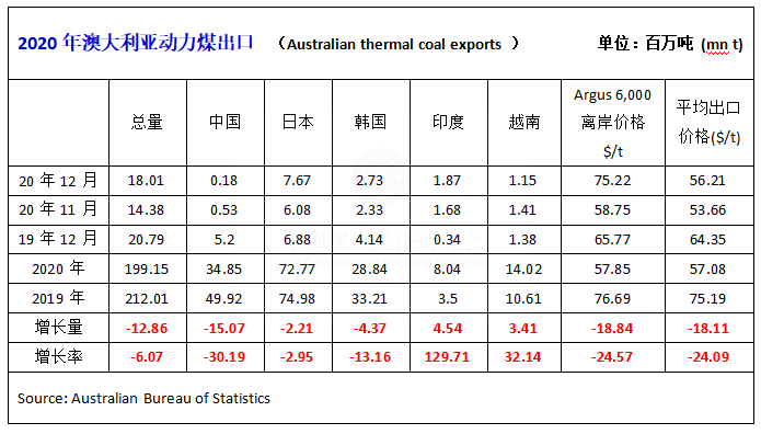 数据还显示,2020年全年澳大利亚动力煤出口总额为113.67亿美元,同比减少45.7亿美元,下降28.7%。2020年动力煤出口平均单价为57.08美元/吨,比2019年的出口平均单价下降24.1%。 澳大利亚煤炭出口下滑,一方面是全球疫情蔓延导致的市场需求影响,另一个更为严峻的挑战是受中国对其煤炭进口的限制。去年11月、12月煤炭出口中国几乎完全中断,眼看着今年的第一个月已经过去,1月份澳大利亚的主要煤炭出口港—格拉斯通港的数据显示,出口到中国的煤炭数量仍然为零。 目前,中澳关系依旧摆在那里没有任何松动和改善。这也让澳政府确实有点着急,如果再不扭转局势,这种不利的处境可能会延续到整个2021年。尽管澳大利亚方面仍然很不情愿,但还是三番五次向中国“求和”,上至总理莫里森下至内阁部长,纷纷站出来表态,希望两国关系能够重修旧好。新上任的澳大利亚贸易部长丹·特汉还专门写信,以寻求重启中澳对话,就煤炭、大麦等商品被禁止进口一事重新商议。莫里森本想指望他能打破僵局,没想到还是吃了闭门羹。 就在这样的节骨眼上,西方某知名媒体的专栏作者Clyde Russell还写专题文章,不顾事实地误导舆论,诬称中国并没有领受与美国前总统特朗普挑起的贸易战的教训(内容可见:China fails to learn from Trump backfire in trade war, is losing against Australia),现在又在与澳大利亚的贸易对抗中居于下风,一味地鼓动澳大利亚政府继续对中国进行挑战。 看来这是一面要挑动澳大利亚继续对抗,同时另一方面还要落井下石,加速抢占瓜分澳大利亚商品出口的市场份额,完全要陷澳大利亚经济坠入严重衰退困境的节奏。 我国外交部发言人多次提醒并强调,造成当前的局面完全是澳方一意孤行的结果,只有澳大利亚正视问题,纠正自身错误,两国关系才有可能重新回到正轨。如果澳大利亚政府当局能够认清时局,真正与中国相向而行,给出有利于中澳互信与合作的实质举动,中澳长期合作应该还是有着良好的光明前景的,从而也能更加充分地发挥两国签订的自由贸易协定和新近签署的区域全面经济伙伴关系协定(RCEP)的优势作用,煤炭等商品的贸易也将逐步恢复到正常关系轨道。