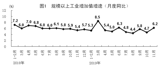 11月份,全国规模以上工业增加值同比增长6.2%,增速比上月加快1.5个百分点。1-11月份,全国规模以上工业增加值增长5.6%,增速与1-10月份持平。分经济类型看,11月份,国有控股企业增加值增长3.7%;股份制企业增长7.0%,外商及港澳台商投资企业增长3.2%;私营企业增长8.9%,增速比上月加快3.5个百分点。分三大门类看,采矿业增加值增长5.7%,制造业增长6.3%,电力、热力、燃气及水生产和供应业增长6.7%。高技术制造业、装备制造业增加值分别增长8.9%、8.5%,分别比规模以上工业快2.7、2.3个百分点;其中医疗仪器设备及仪器仪表制造业、电子及通信设备制造业分别增长12.6%和10.8%,分别比规模以上工业快6.4和4.6个百分点。太阳能电池和集成电路产量分别增长23.0%和18.2%。汽车产量增长3.7%。制造业采购经理指数(PMI)分项指数中,生产指数、新订单指数和供应商配送时间指数分别为52.6%、51.3%和50.5%,均高于临界点且均比上月有所回升。制造业生产经营活动预期指数为54.9%,位于较高景气区间。