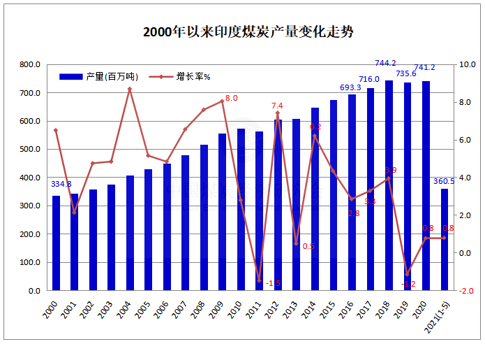 2021年1-5月印度煤炭产量同比增长0.8%