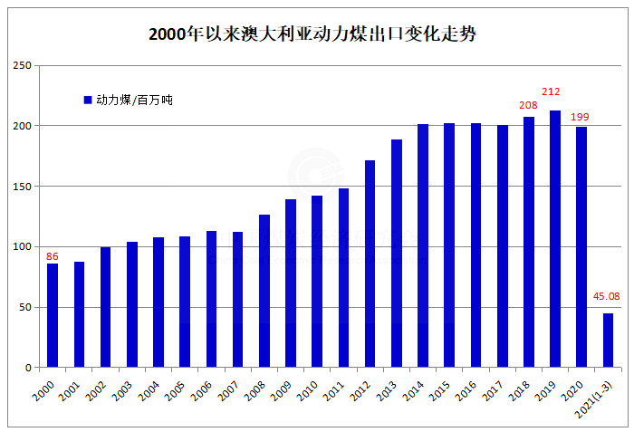 2021年一季度澳大利亚动力煤出口同比下降13.3%