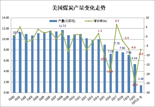 2021年一季度美国煤炭产量同比下降6.9%