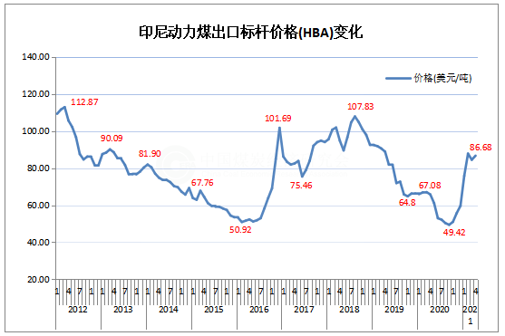 据印度尼西亚能源与矿产资源部(Indonesia's Ministry of Energy and Mineral Resources)发布的信息, 2021年4月份印尼动力煤参考价(Indonesian Coal Price Reference ,HBA)确定为86.68美元/吨,环比提高2.19美元/吨,上升2.59%;同比增加20.91美元/吨…