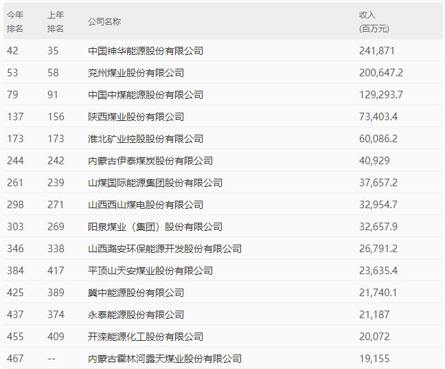 15家煤炭上市公司上榜2020财富中国500强